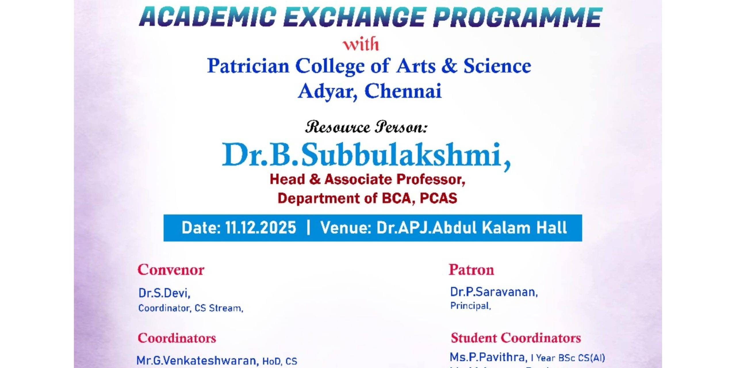 The Computer Science Stream Departments of Computer Science, Information Technology, Computer Applications & Artificial Intelligence jointly organzies an Academic Exchange Programme with Patrician College of Arts and Science, Chennai.