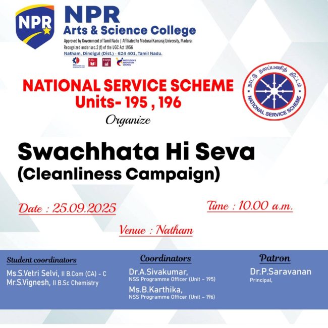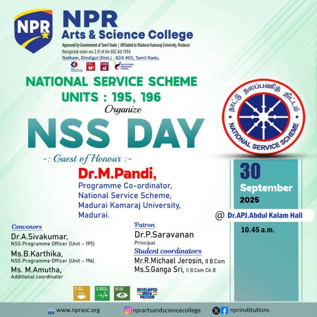 The National Service Scheme Units (195 & 196) organizes a NSS Day Celebration for their students Resource Person: Dr. M. Pandi, Programme Co-ordinator, National Service Scheme, Madurai Kamaraj University, Madurai.