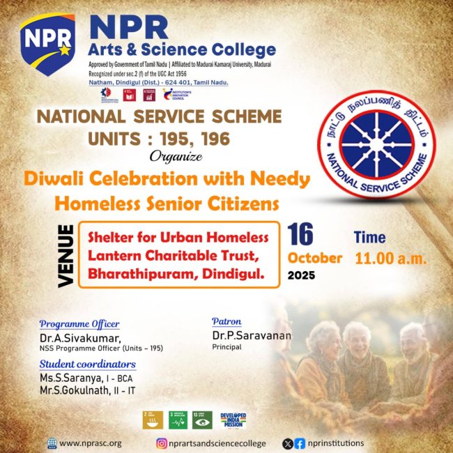 The National Service Scheme Units (195 & 196) organizes a Diwali Celebration with Needy Homeless Senior Cityzens