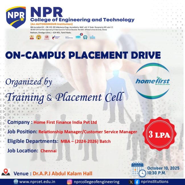 The NPR College of Engineering and Technology organizes a Fresher’s Day for their freshmen students of the 2025-29 Batch. Resource Person: Shri. Jeyaprakash Gandhi, Career Consultant and Analyst.