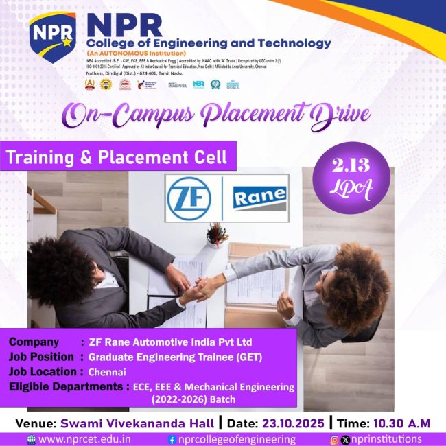 The Training and Placement Cell organizes an On-Campus Placement Drive – ZF Rane Automotive India Private Limited for their Senior Year Mechanical, EEE & ECE Engineering Students Resource Persons: HR Team from ZF Rane Automotive India Private Limited, Chennai.