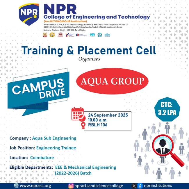 The Training and Placement Cell organizes an On-Campus Placement Drive – Aqua Group for their Senior Year Mechanical, Electrical and Electronics Engineering Students Resource Persons HR Team from Aqua Group, Coimbatore