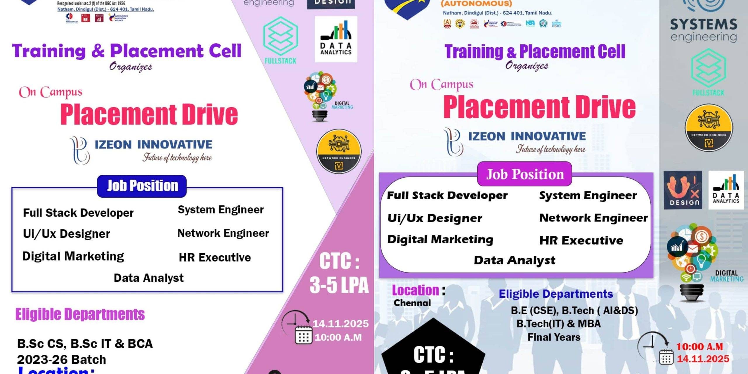 The Training & Placement Cell organizes an On-Campus Placement Drive – Izeon Innovative for their final-year B.E. CSE, B.Tech., MBA, B.Sc. (CS, IT), and BCA Students