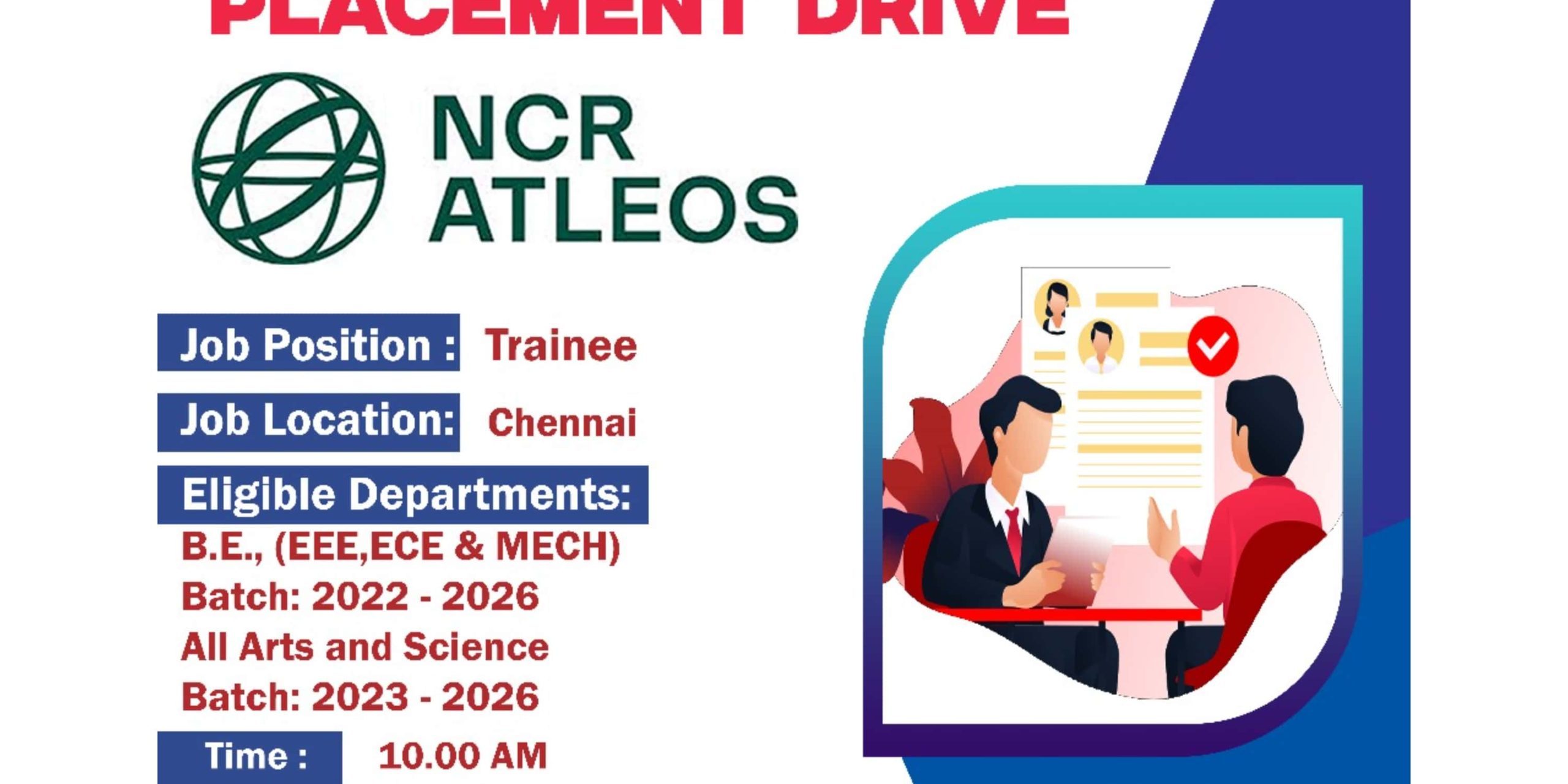 The Training and Placement Cell organizes an On-Campus Placement Drive – NCR Atleos for their Senior Year Electrical, Mechanical and Electronics Engineering students & all the Senior Year Students of Arts and Science Students