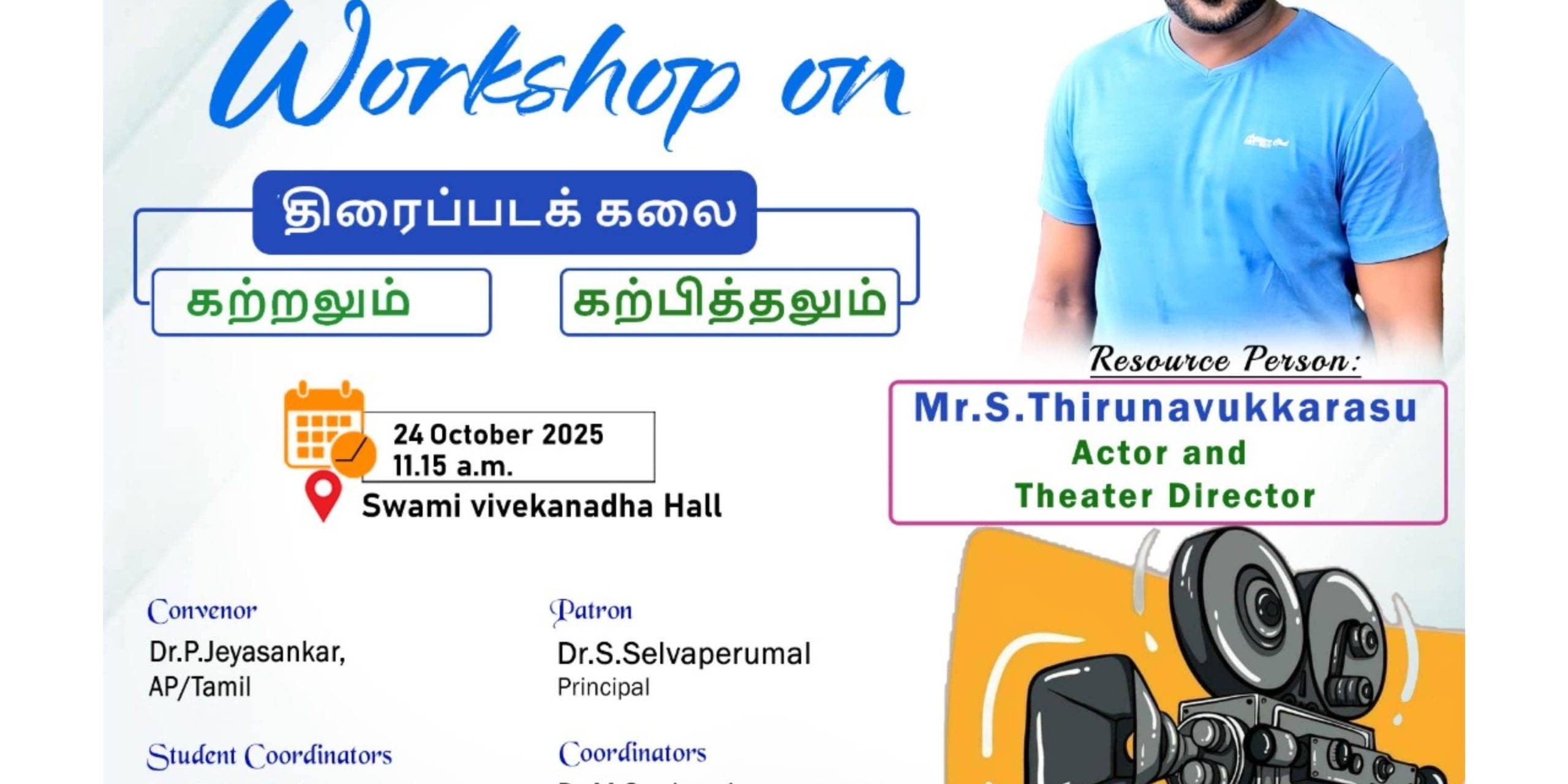 Oct302025Upcoming EventsThe Tamil Mandram organizes Workshop on திரைப்படக்கலை: கற்றலும் கற்பித்தலும் for their students Category: Upcoming EventsBy giadminOctober 30, 2025Leave a comment Author: giadmin http://nprcolleges.org Post navigationPreviousPrevious post:World Anaesthesia DayNextNext post:Hands-on Training on Tekla Structures for Innovative Design and PrototypingRelated posts8 Day Value Added Course on Full Stack DevelopmentNovember 9, 2025Seminar on Smart Edge Building Intelligent IoT Solutions with AINovember 7, 2025Road Safety Awareness ProgrammeNovember 7, 2025HR ConnectNovember 5, 2025MoU Signing Ceremony and Guest LectureNovember 5, 2025On Campus Placement Drive – Avinash IndustriesNovember 5, 2025